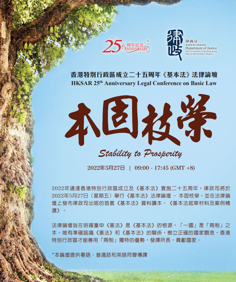 大公文匯全媒體報道,今年是香港特別行政區成立及基本法實施25周年,律政司今日(27日)舉行基本法法律論壇-本固枝榮,行政長官林鄭月娥、國務院港澳辦副主任王靈桂、香港中聯辦副主任陳冬將致辭。此外,法律論壇上將發布律政司出版的首套基本法資料讀本:《基本法起草材料及案例精選》。