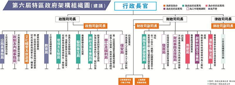 立法會人事編制小組委員會通過因為架構重組,增設的13個政治委任官員及57個公務員職位,每年涉及接近一億元的薪酬開支。新方案建議下屆政府增設三名副司長,並改為「三司十五局」,運輸及房屋局會分拆為房屋局和運輸及物流局,並成立新的文化體育及旅遊局等。