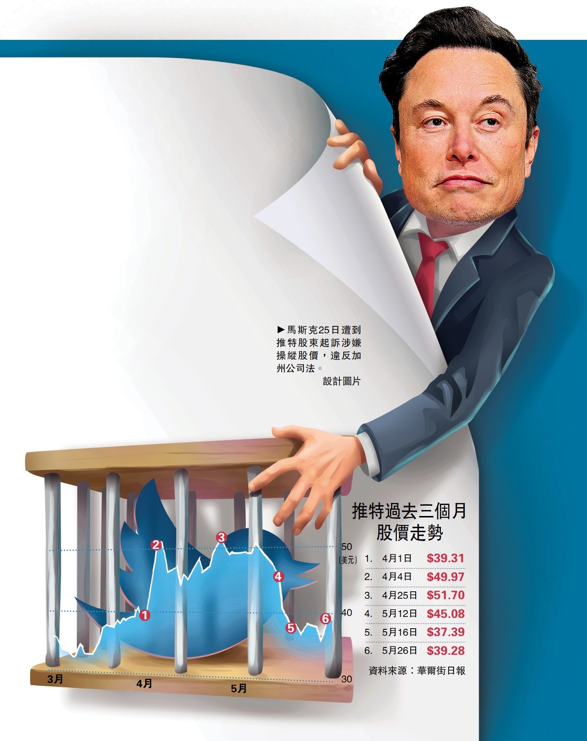 【大公報綜合彭博社、法新社、《華爾街日報》報道】社交媒體推特(Twitter)一批股東控告全球首富馬斯克及Twitter,指其在多個方面違反加州企業法例,並涉嫌操縱股價。另外,美國證監會(SEC)27日公開一封4月致馬斯克的信件,顯示當局已經開始調查他的推特收購計劃。
