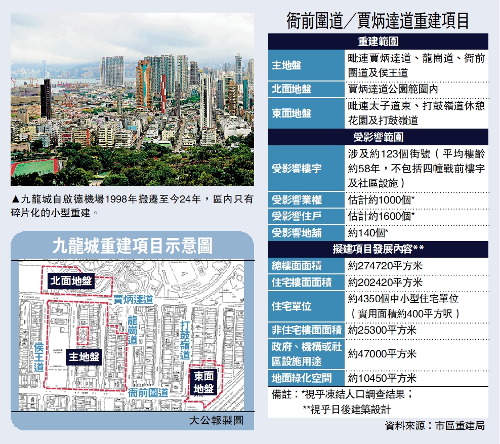 九龍城舊區自啟德機場1998年搬遷,至今24年,其間只有碎片化式的小型重建,居民等待重建改善環境「等到頸都長」。有早年參與制定《九龍城市區更新計劃》的學者認為,舊區重建面對缺乏經濟誘因、重置社區設施難度大等難題,政府須突破現有政策框架,引入更多規劃工具,「配合精簡程序、重組政策局,相信舊區重建可提速提效。」