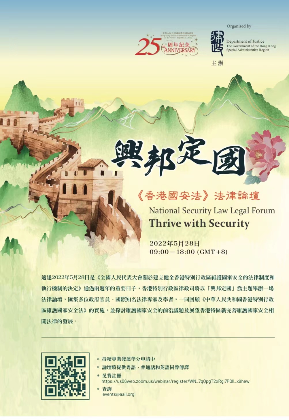 (大公文匯全媒體記者 李九歌)今日(28日)是《全國人民代表大會關於建立健全香港特別行政區維護國家安全的法律制度和執行機制的決定》通過2周年的重要日子,律政司以「興邦定國」為主題舉辦法律論壇,匯集多位政府官員、國際知名法律專家及學者,一同回顧《中華人民共和國香港特別行政區維護國家安全法》(《香港國安法》)的實施,探討維護國家安全的前沿議題及展望香港特區就完善維護國家安全相關法律的發展。論壇主題演講分為四部分,主題分別為全國人大《528決定》、由亂轉治──法治精神典範、由治及興、《香港國安法》的展望;並設有《香港國安法》案例研讀及國際案例比較、維護國家安全的前沿議題、完善香港特區的維護國家安全法律三個座談環節。