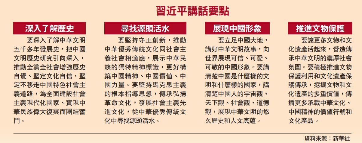 習近平指出,各級領導幹部都要重視文物和文化遺產保護傳承工作,為歷史和考古工作者開展研究、學習深造、研修交流提供更多政策支持。要營造傳承中華文明的濃厚社會氛圍,廣泛宣傳中華文明探源工程等研究成果,教育引導群眾特別是青少年更好認識和認同中華文明,增強做中國人的志氣、骨氣、底氣。