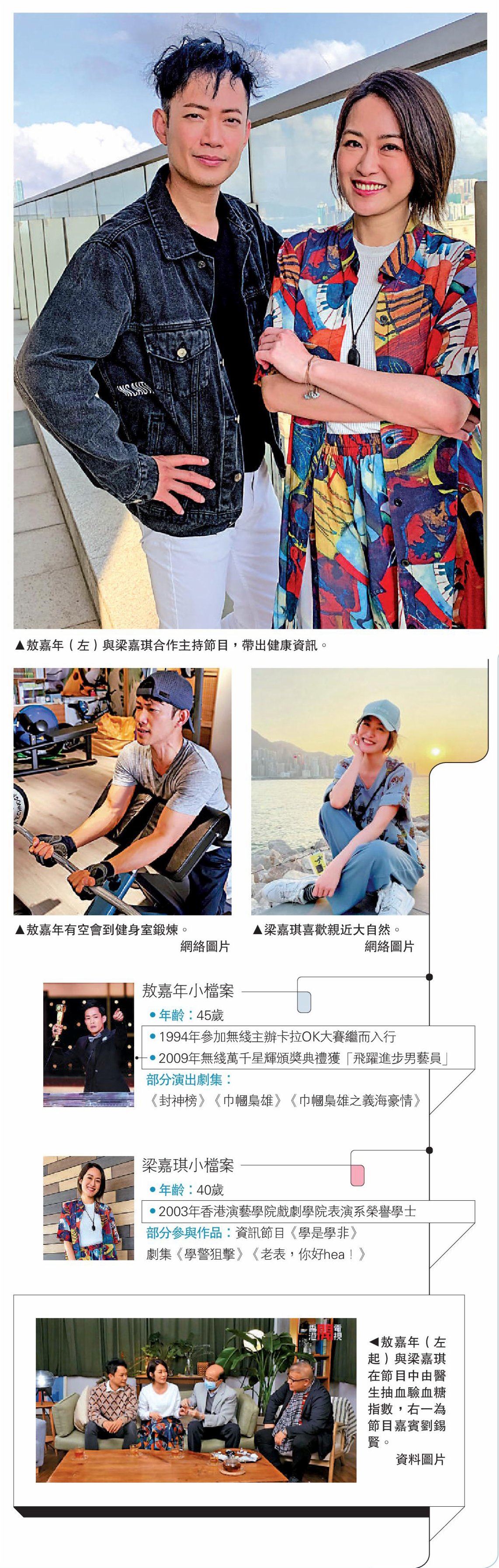 敖嘉年與梁嘉琪最近為香港開電視主持《嘉嘉醫療自助班》節目,內容以處境喜劇方式帶出香港不同年齡層的人所面對的健康問題,每集會邀請醫生講解分析,帶出正確的健康訊息。二人接受大公報記者專訪時,分享了做主持的感受。敖嘉年表示已有十幾年沒有主持節目,他覺得有一位夾到的拍檔最重要,並讚梁嘉琪性格爽朗,能夠跟她合作真是「無懈可擊」,亦期待會迸發火花。梁嘉琪沒演戲已有一段時間,這次在節目中要在短劇中穿梭演出,她表示可以一過戲癮。