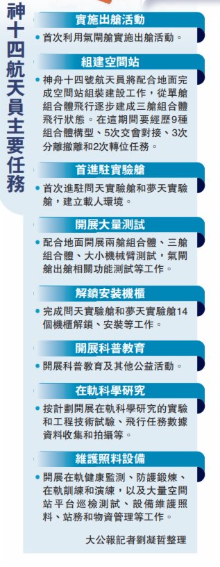 (大公報 記者 劉凝哲)中國空間站建造階段的首次載人飛行神舟十四號任務,進入發射前關鍵階段。中國載人航天工程辦公室發布消息,5月29日,神舟十四號載人飛船與長征二號F遙十四運載火箭組合體已轉運至酒泉衛星發射中心發射區,將擇機搭載3名航天員升空,開啟6個月的在軌駐留。年內,天和核心艙和待發射的「問天」、「夢天」實驗艙將共同構築「三室」空間站。此外官方還正式發布本次任務的飛行任務標識,顯示出神十四飛船以徑向對接的方式與空間站組合體進行交會對接。
