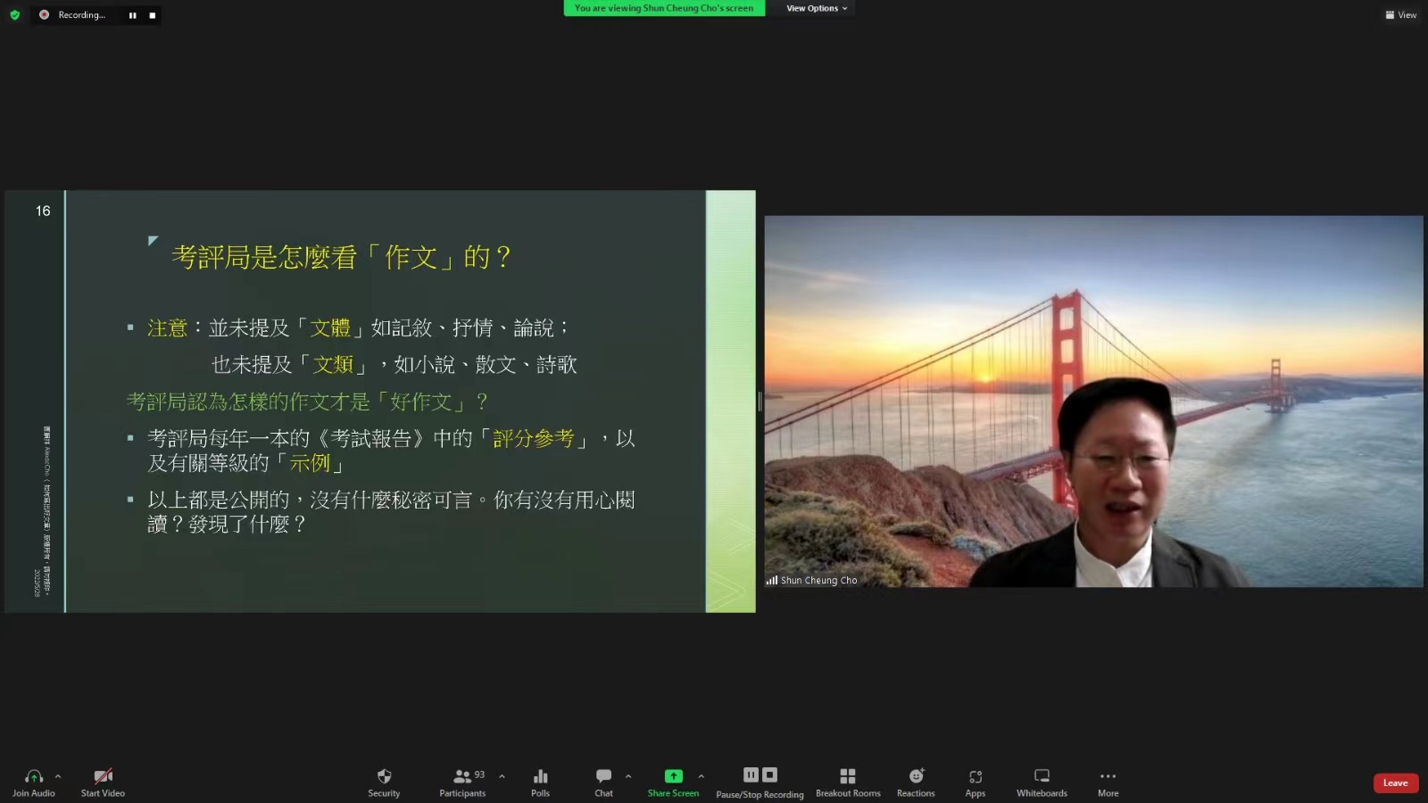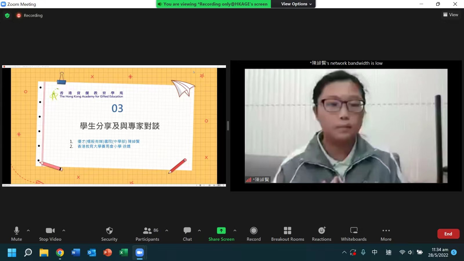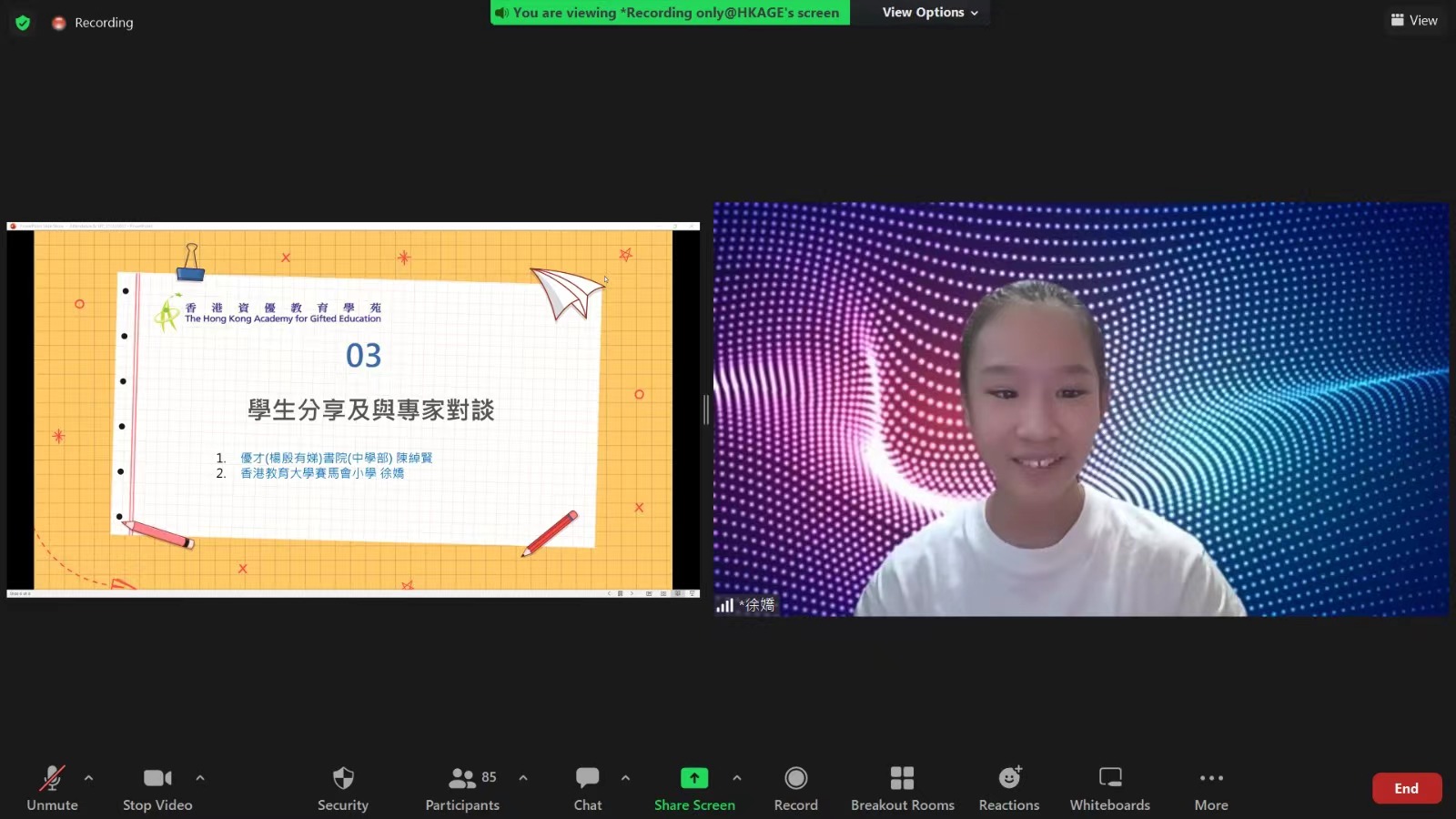 第三環節是「學生分享與專家對談」,由去年獲獎的兩位同學,優才(楊殷有娣)書院(中學部)的陳綽賢及香港教育大學賽馬會小學的徐嬌分享心得。最後是線上學生提問,包括怎樣學好中文、怎樣理解文言文及作答欠準確,以及如何有新的立意等。