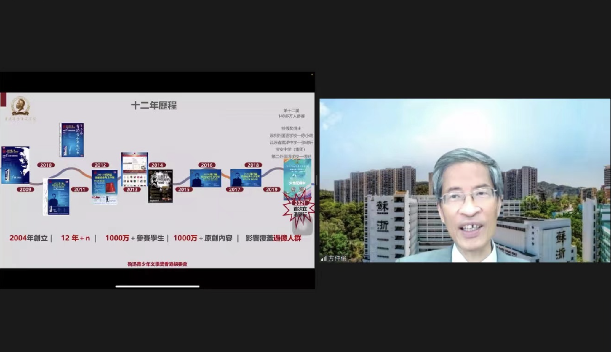 此次講座分為四個環節:第一環節由魯迅青少年文學獎香港組委會成員、香港島校長聯會主席、蘇浙公學校長方仲倫簡介第十三屆魯迅青少年文學獎香港賽區的賽事。