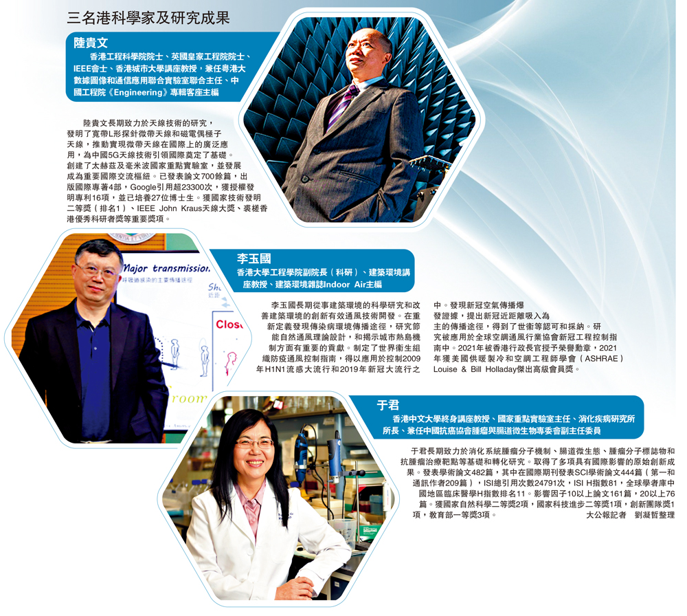 【大公報記者 劉凝哲、鍾怡】中國工程院第十六次院士大會30日在北京召開,會議同時舉行了第十四屆光華工程科技獎頒獎儀式,39位專家榮獲光華工程科技獎。值得一提的是,三名香港科學家獲得本屆光華工程科技獎,他們是建築環境工程專家、香港大學工程學院副院長(科研)李玉國教授,電磁場及天線技術專家、香港城市大學講座教授陸貴文以及研究胃腸道腫瘤方向的香港中文大學終身講座教授于君。其中李玉國提出新冠近距離吸入為主的傳播途徑;陸貴文為中國5G天線技術引領國際奠定了基礎;于君長期致力於消化系統腫瘤研究。