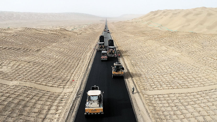 「針對填方量大、推運距離遠的施工段,項目參照煤礦運輸方式,採用皮帶輸送機進行風積沙的遠距離運輸,因風積沙無黏聚性、表面鬆散,項目自主發明『沙基整平板』,保證了路床頂的平整度。」中國交建相關負責人表示,沙基形成後,公路有了較平整的基礎,為了防止風積沙路基遭到惡劣環境的破壞,影響施工質量,項目以人工或機械的方式將成卷的編織布鋪在整平的沙基上。