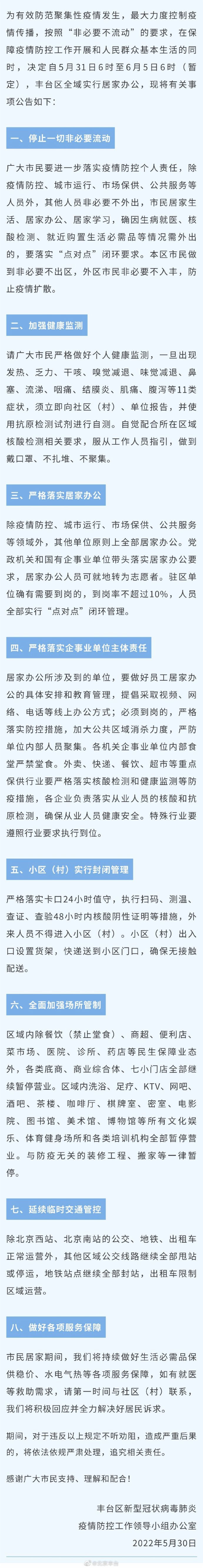 北京丰台區新型冠狀病毒肺炎疫情防控工作領導小組辦公室今日(31日)凌晨1時左右發布消息:為有效防範聚集性疫情發生,最大力度控制疫情傳播,按照「非必要不流動」的要求,在保障疫情防控工作開展和人民群眾基本生活的同時,決定自5月31日6時至6月5日6時(暫定),丰台區全域實行居家辦公。