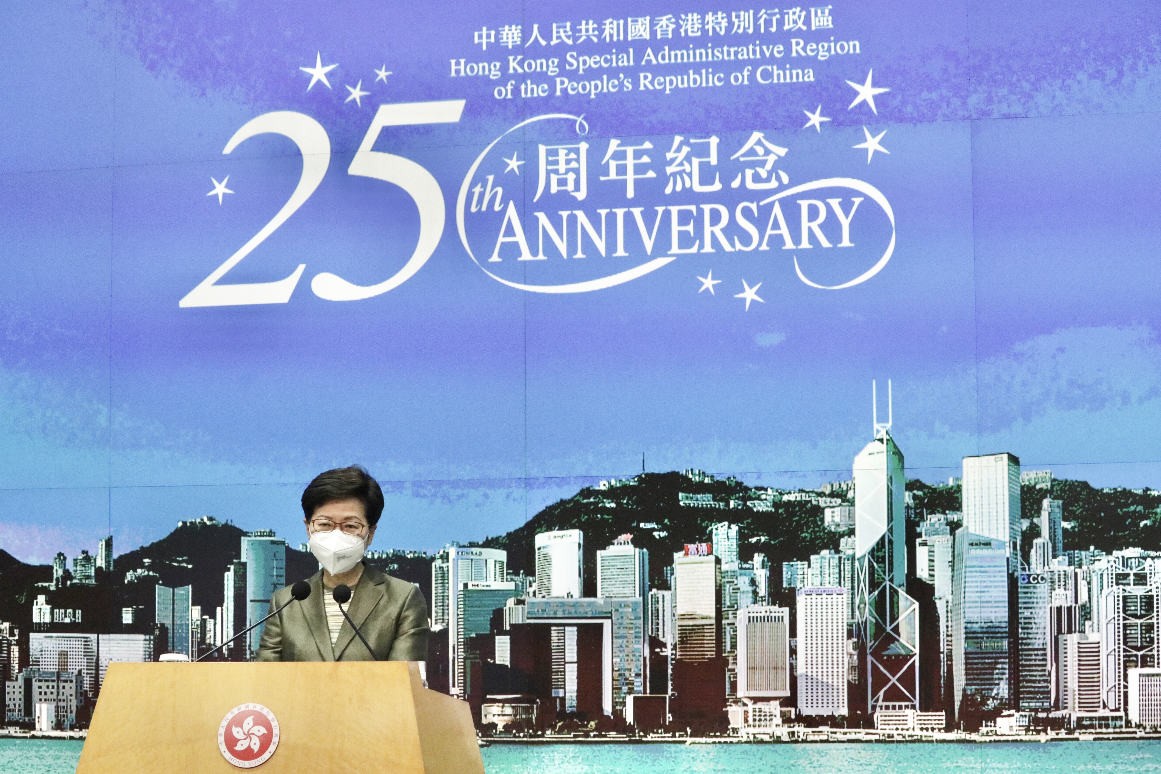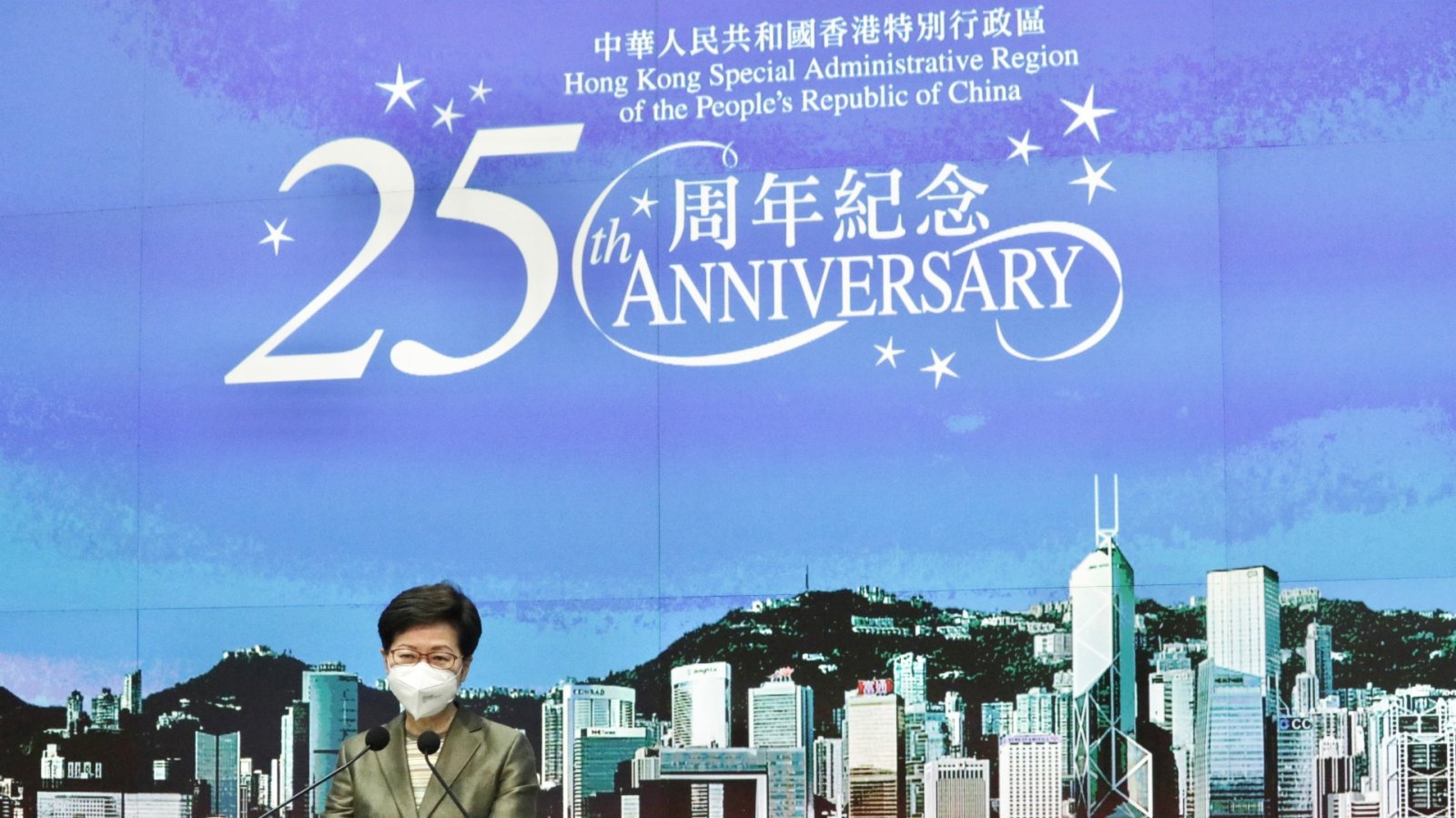 大公文匯全媒體報道,今年是香港回歸祖國25周年,行政長官林鄭月娥今日(31日)出席行會前見記者時表示,疫情平穩之下,特區政府會重啟香港回歸25周年活動的籌備工作,主題曲《前》今首播,由張家誠作曲、陳少琪填詞,28名歌手合唱,包括譚詠麟、張學友、劉德華、楊千嬅、容祖兒、梁漢文等,亦有視障女高音蕭凱恩參與。