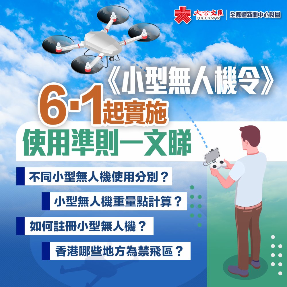 大公文匯全媒體報道,隨着科技的發展,無人機愈來愈普及,因操作簡單易學,連小學生也可以瞬間成為高空航拍師。惟近年發生多宗墜機傷人及違例航拍事件,為保障市民安全,政府6月1日起實施《小型無人機令》,要求除重量不超過250的甲1類小型無人機外,所有無人機、遙控飛機和遙控駕駛員均須註冊,違例者可處罰款10萬元及監禁兩年。點新聞現為大家整理了小型無人機的使用規範及相關註冊程序,快來一文看清!