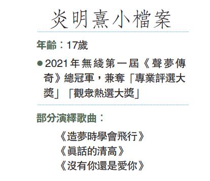 相比二〇二一年在香港《聲夢傳奇》的舞台,今年在內地《聲生不息》的舞台上,炎明熹擺脫了最初如影隨形的緊張感,開始懂得享受舞台。這種懂得,離不開前輩哥哥、姐姐傳授一些經驗小錦囊。她說,(李)克勤老師會在綵排現場看自己的表現,然後實時提出一些建議;(楊)千嬅姐會有不少克服舞台緊張的「金句名言」。最為受用的一句話是:「你緊張就對了,說明你重視這個舞台。」她形容,這些說話好像在心裏打了個底一樣,因此就開始有了享受舞台的心情。