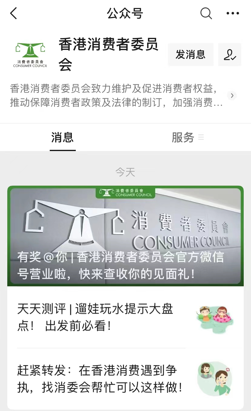 據悉,「香港消費者委員會」公眾號主要發布各種消費者資訊,緊貼市民大眾和旅客所需,致力成為「掌上消費百科全書」。微信公眾號有4大亮點,包括為消費者提供消費全攻略,分享時令消費文章,解說消費陷阱和投訴個案,並提供不同的格價比較工具,讓大眾成為精明的消費者。