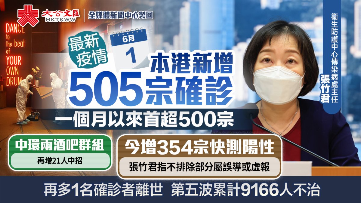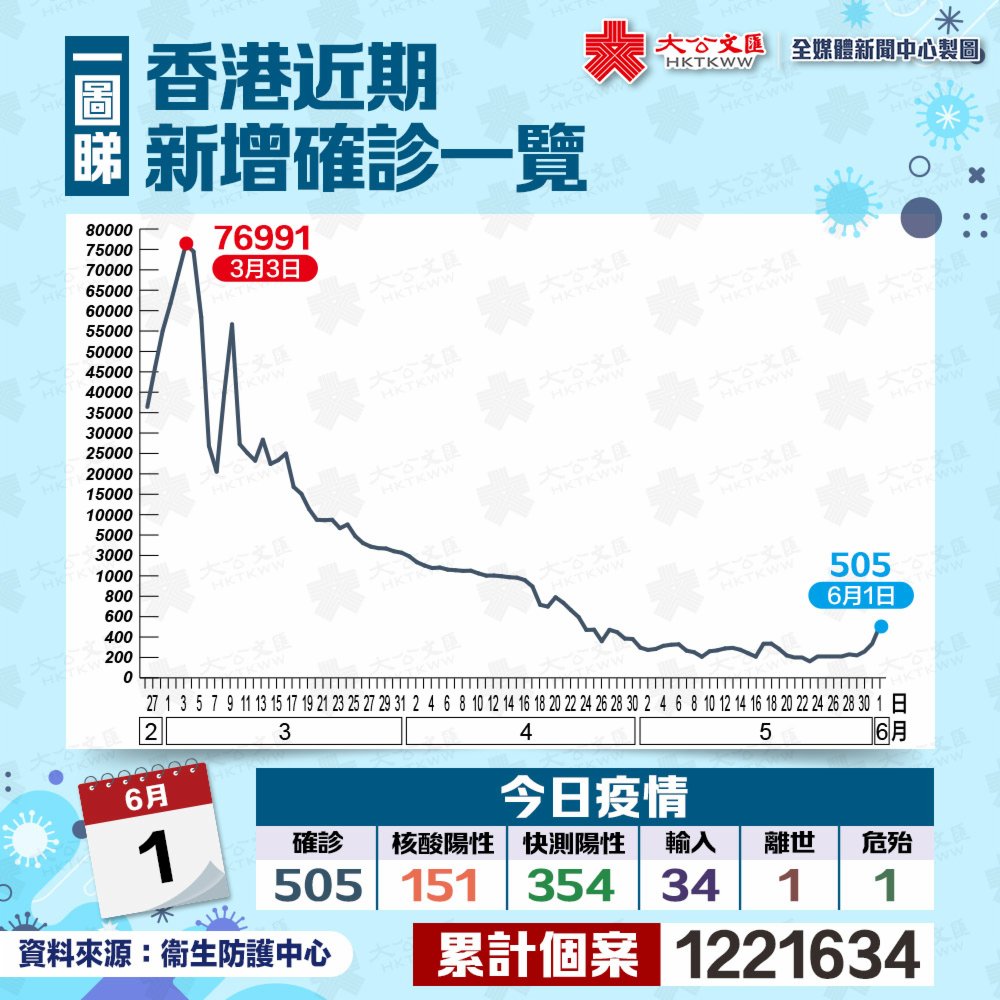 大公文匯全媒體報道,本港第五波疫情緩和,衞生署及醫管局今日(6月1日)下午舉行疫情記者會。衞生署衞生防護中心傳染病處主任張竹君公布,截至今日零時,本港新增505宗確診個案,當中151宗為核酸檢測確診,354宗為快測陽性個案。新增個案中,包括34宗輸入個案。本港第五波疫情累計1200543宗個案。
