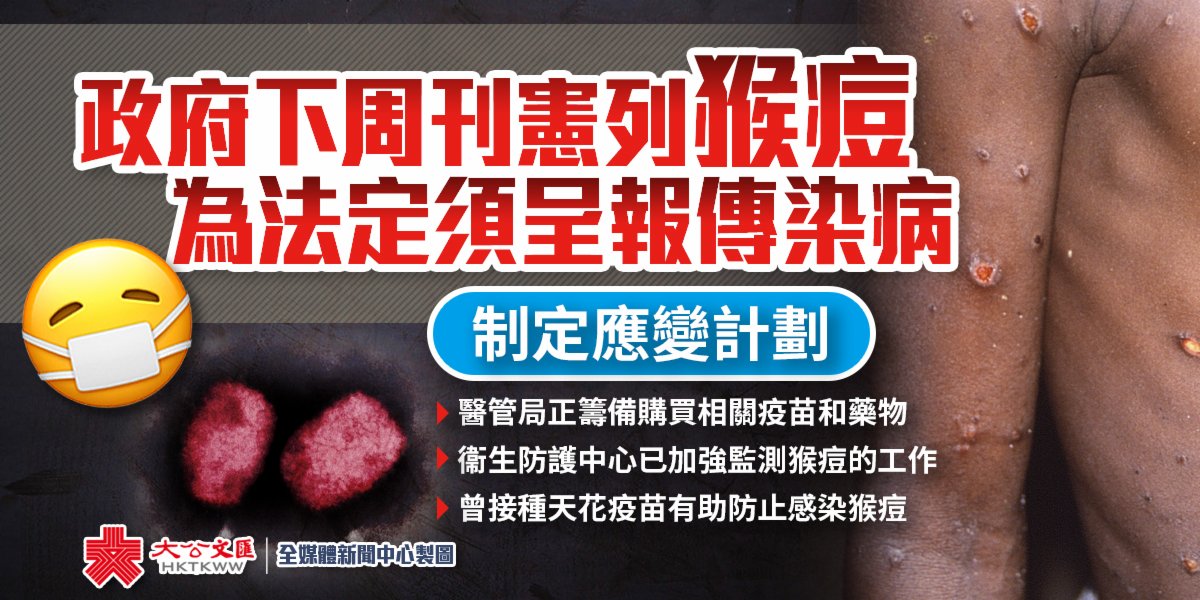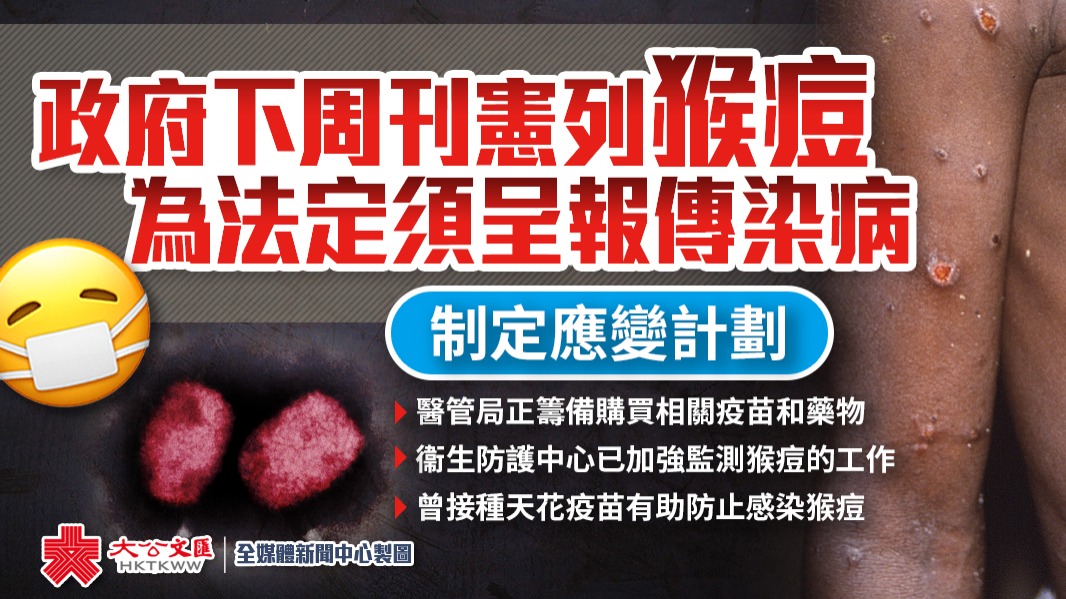 政府正為猴痘制訂應變計劃,採納三級應變級別(戒備、嚴重及緊急),按風險評估及其對社會造成的健康影響而啓動,詳情下周公布。
