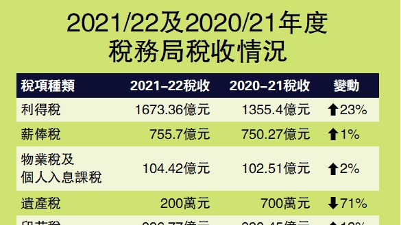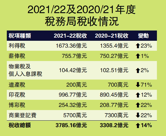 新冠疫情影響市民生活,但股市交易仍暢旺,稅務局於上年度的印花稅收入為996億元,按年增加106億元,升幅為12%;博彩稅收入254億元,按年增加22%。整體稅收錄得3785億元,創歷來新高,按年增加477億元,主要因為利得稅收入增加,達1673億元,較對上一年度增加318億元,升幅高達23%。