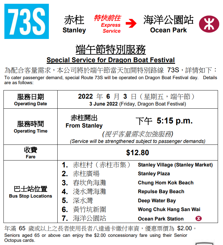 城巴特設73S號線,提供一個班次由赤柱村開出,經赤柱廣場、舂坎角海灘、淺水灣及深水灣,前往海洋公園站。全程車費為港幣12.8元,服務時間為下午5時15分。