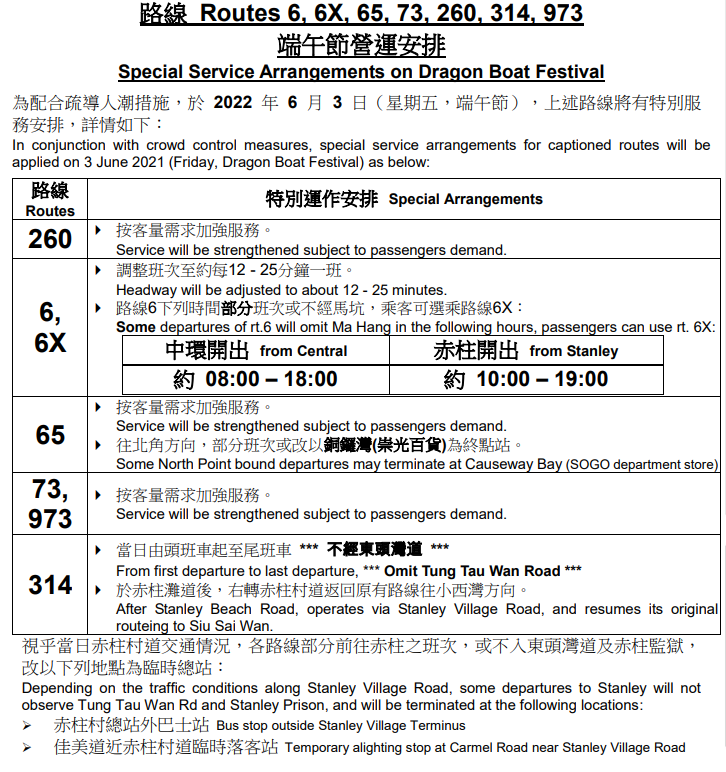 此外,城巴新巴9條路線亦將實施巴士站臨時安排,包括城巴6、6X、73、73S、260、314、973 號線及新巴14、65號線。