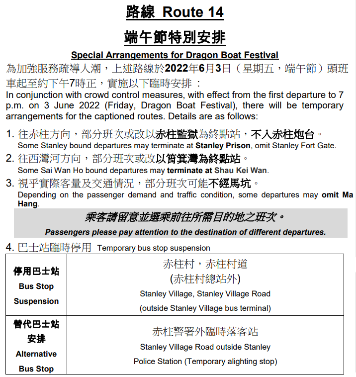 新巴14號線部分班次將不經赤柱炮台及馬坑,或改以赤柱監獄或筲箕灣為終點站;