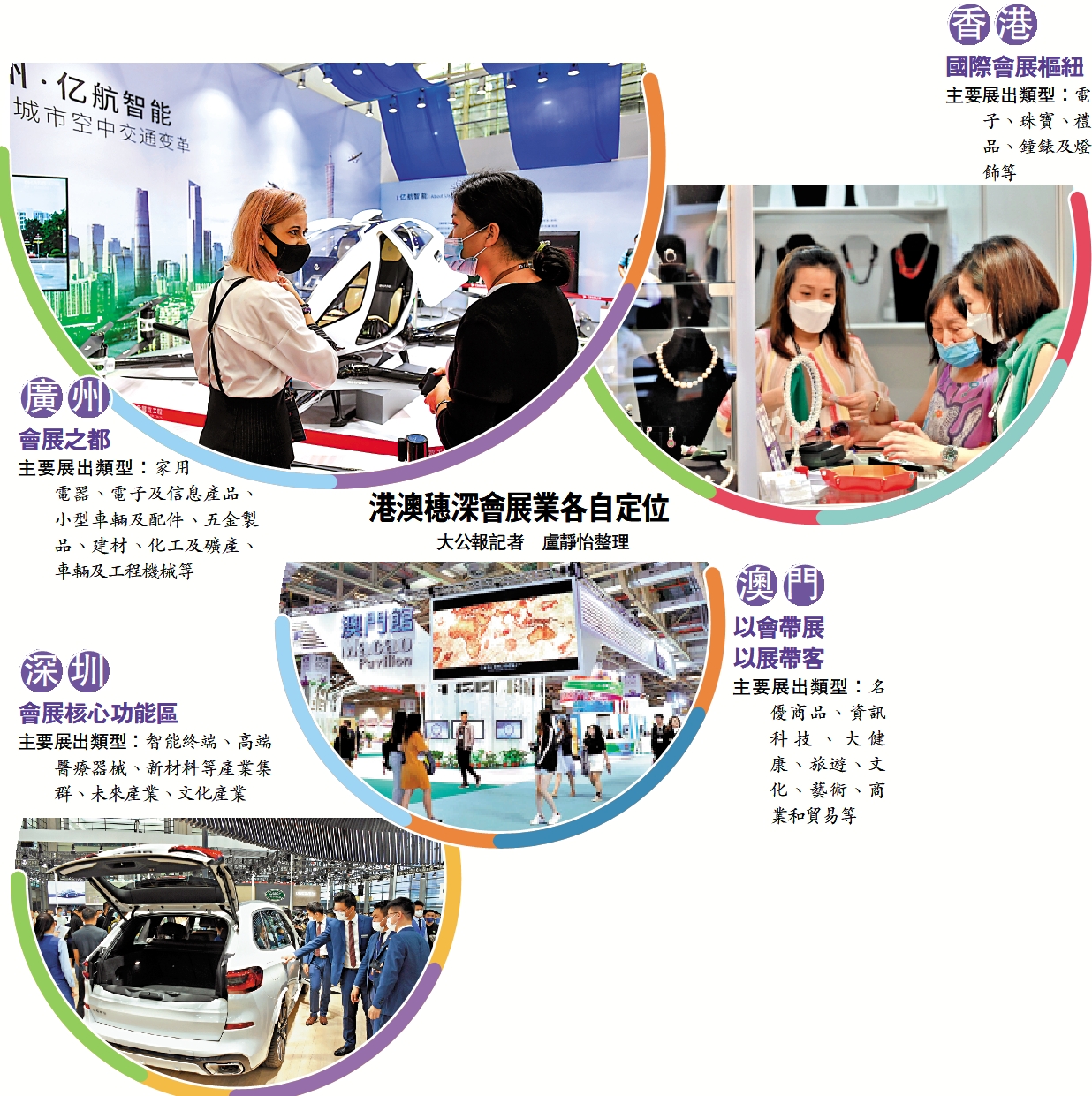 對於港澳穗深會展如何錯位發展,廣東省體制改革研究會執行會長彭澎表示,廣州立足商貿會展,以廣交會、材博會、美博會為龍頭,深圳則立足文化與高科技,以高交會、文博會為龍頭。香港以電子、珠寶、禮品、鐘錶及燈飾等為主,澳門以文旅、大健康、藝術等類型為主,各有所長。「四座城市合理地配置和布局資源,就可以加強聯動,將大灣區會展產業做大。」