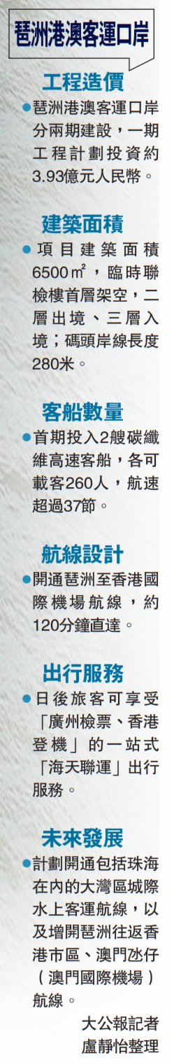 (大公報 記者 盧靜怡、吳俊宏、李永青)2日,記者從珠江船務獲悉,廣州琶洲港澳客運口岸碼頭工程近日順利通過竣工驗收,標誌着這座集跨境、城際、海島、珠江遊的水上交通旅遊綜合體,朝着開港通航的目標更近一步。琶洲港澳客運口岸碼頭首期投入2艘碳纖維高速客船,開通琶洲至香港國際機場航線,約120分鐘直達,未來將增開琶洲往返香港市區、澳門氹仔(澳門國際機場)航線。