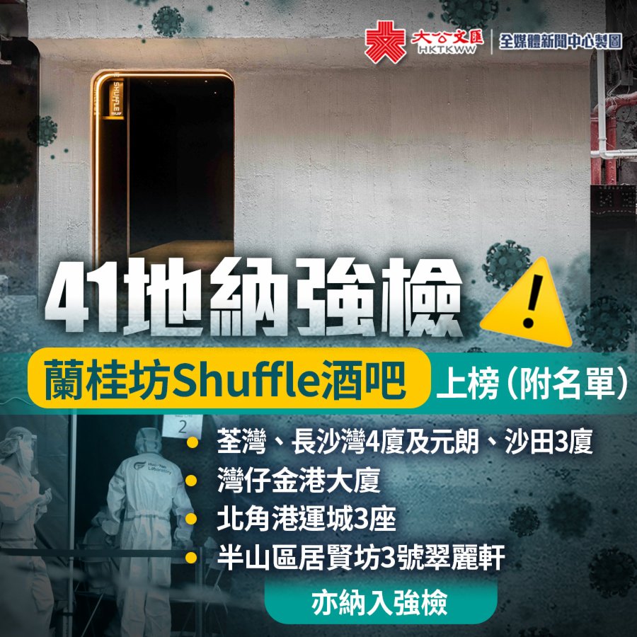 強檢名單中,包括今日爆疫的蘭桂坊Shuffle酒吧。此外,荃灣、長沙灣4廈及元朗、沙田3廈亦上榜。