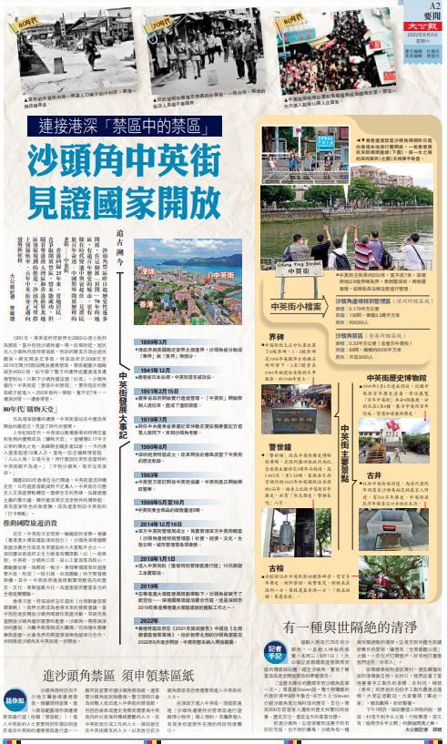 (大公報記者 曾敏捷)沙頭角禁區昨日起歷史性逐步開放,在這個被「封閉」70年的地區,有逾百年歷史的墟市,更有一條在時代變遷中興衰起伏、見證民族百年命運、中國對外開放歷程的老街——中英街。