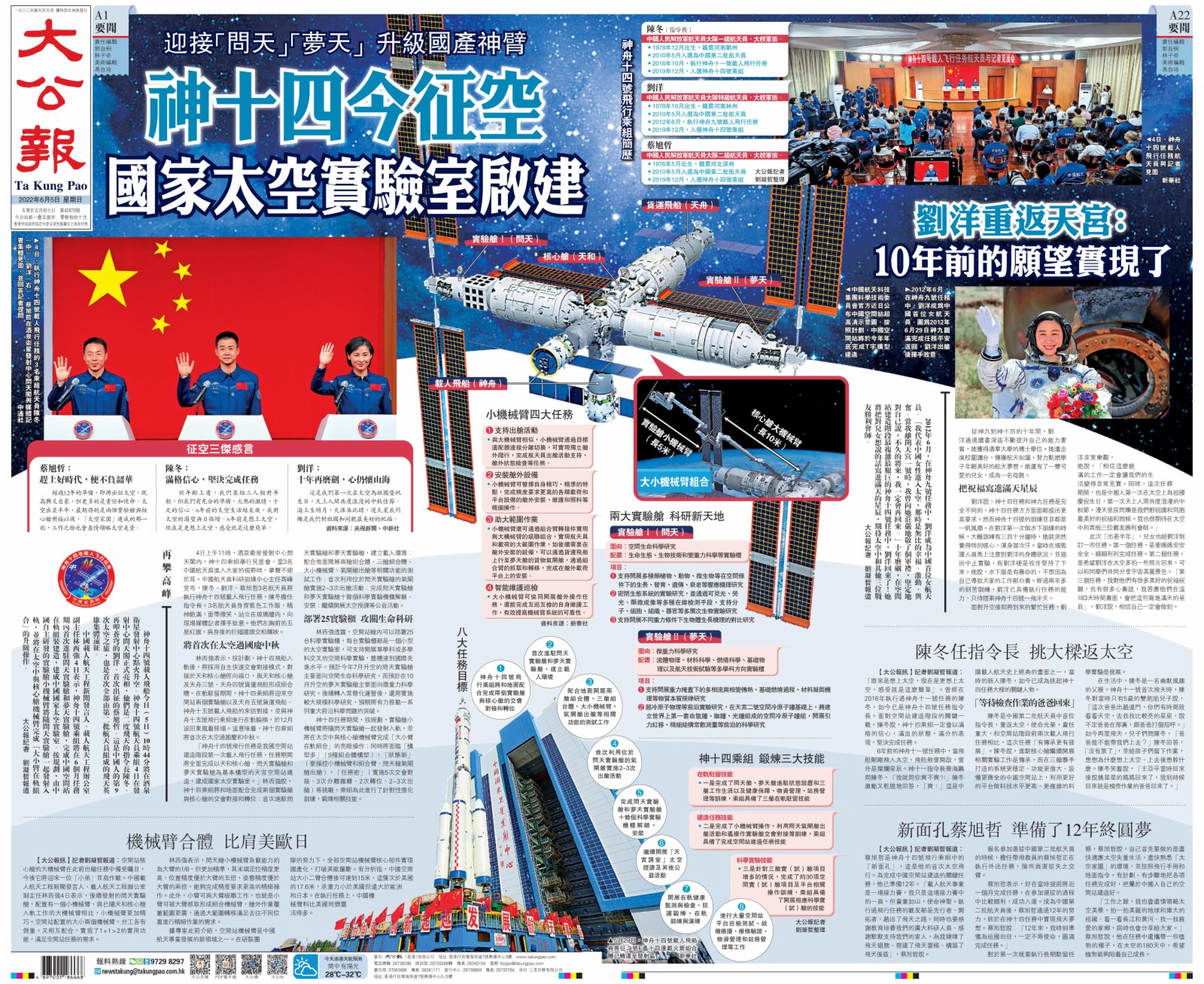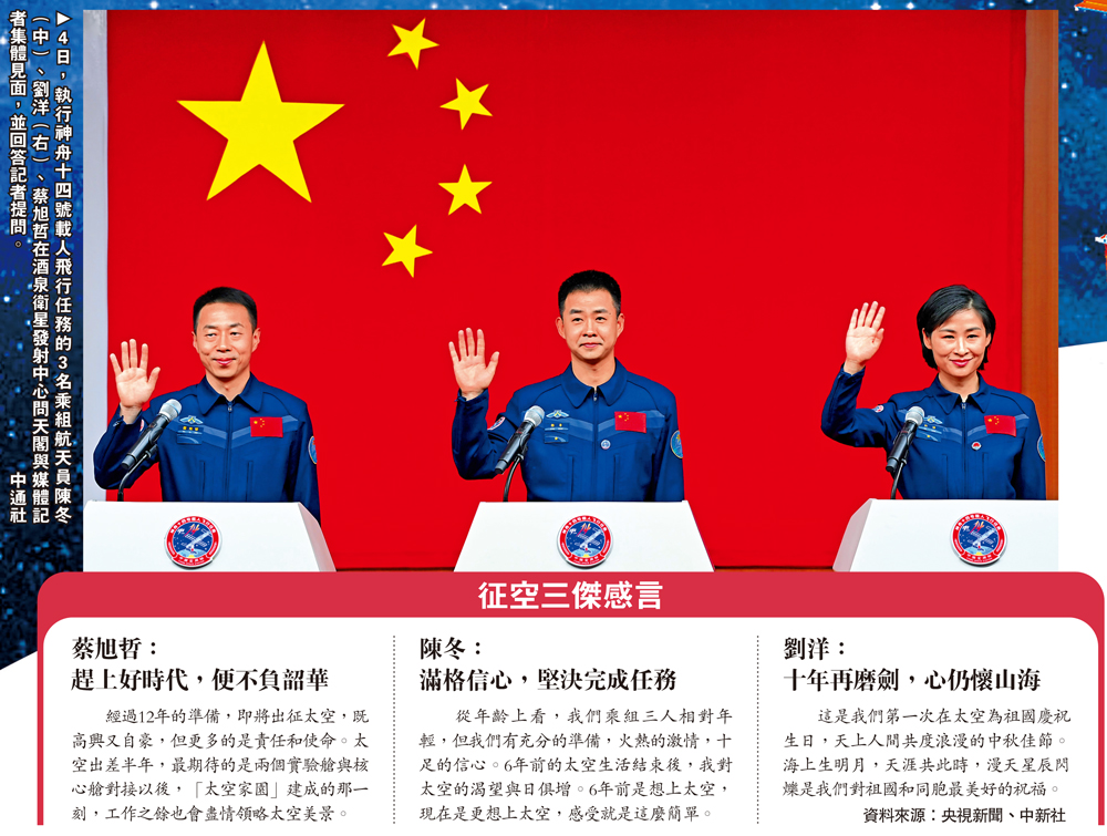 (大公報記者 劉凝哲報道)神舟十四號載人飛船今日(5日)10時44分將在酒泉衛星發射中心點火升空。神舟十四號航天員乘組4日在發射中心問天閣正式亮相,他們是二度飛天的指令長陳冬、再叩蒼穹的劉洋、首次出征的蔡旭哲。這是中國人的第9次太空之旅,也是首次全部由第二批航天員組成的飛天英雄集體遠征。