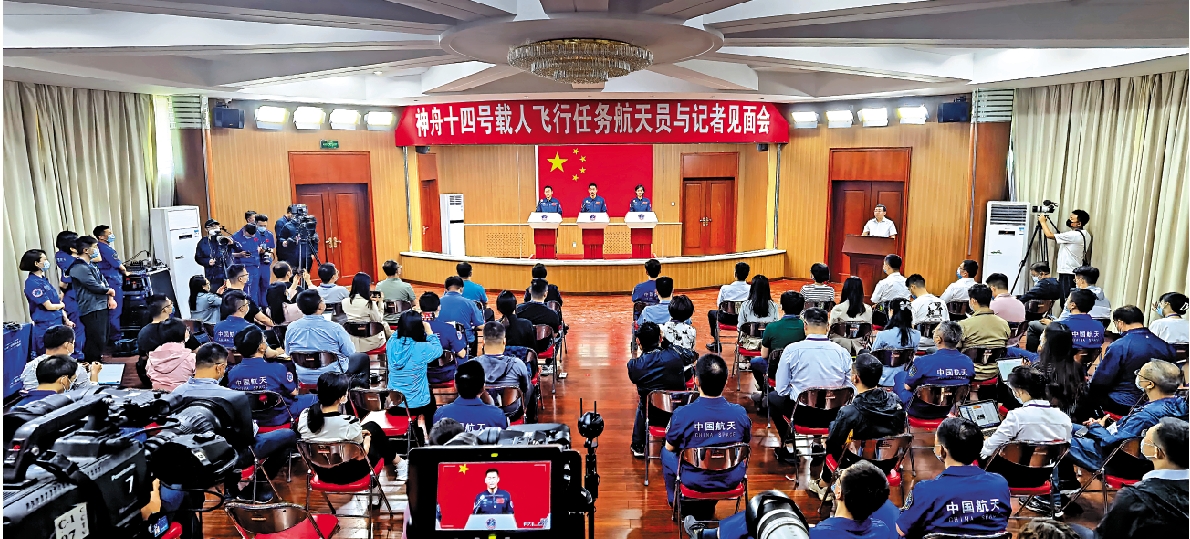 4日上午11時,酒泉衛星發射中心問天閣內,神十四乘組舉行見面會,當3名中國航天員進入大家的視野時,掌聲不絕於耳。中國航天員科研訓練中心主任高峰宣布,陳冬、劉洋、蔡旭哲3名航天員將執行神舟十四號載人飛行任務,陳冬擔任指令長。3名航天員身穿藍色工作服,精神飽滿,面帶微笑,站立在玻璃牆內,向現場媒體記者揮手致意。他們左胸前的五星紅旗,與身後的巨幅國旗交相輝映。