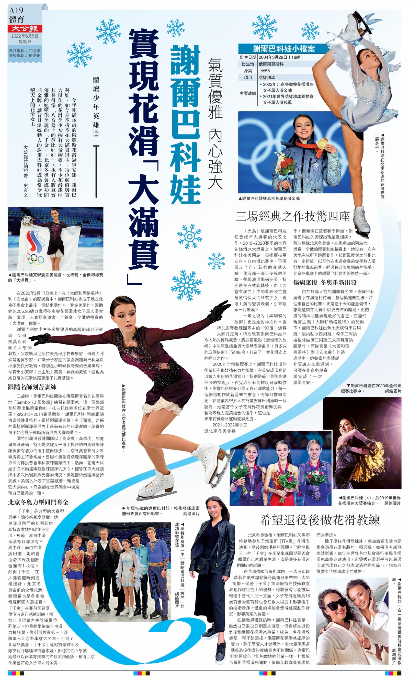 (大公報特約記者 史玄之)今年剛滿18歲的俄羅斯花滑冠軍安娜·謝爾巴科娃,如今是不折不扣大滿貫得主。這位顏值與實力俱佳的花滑美少女擁有大量擁躉,不少花滑迷稱其長得像「八音盒上的芭比娃娃」,也有人將氣質優雅的她稱作美麗的「千金」。北京冬奧會成功問鼎金牌,讓昔日溫婉動人的謝爾巴科娃成為當今冠絕天下的花滑女王。