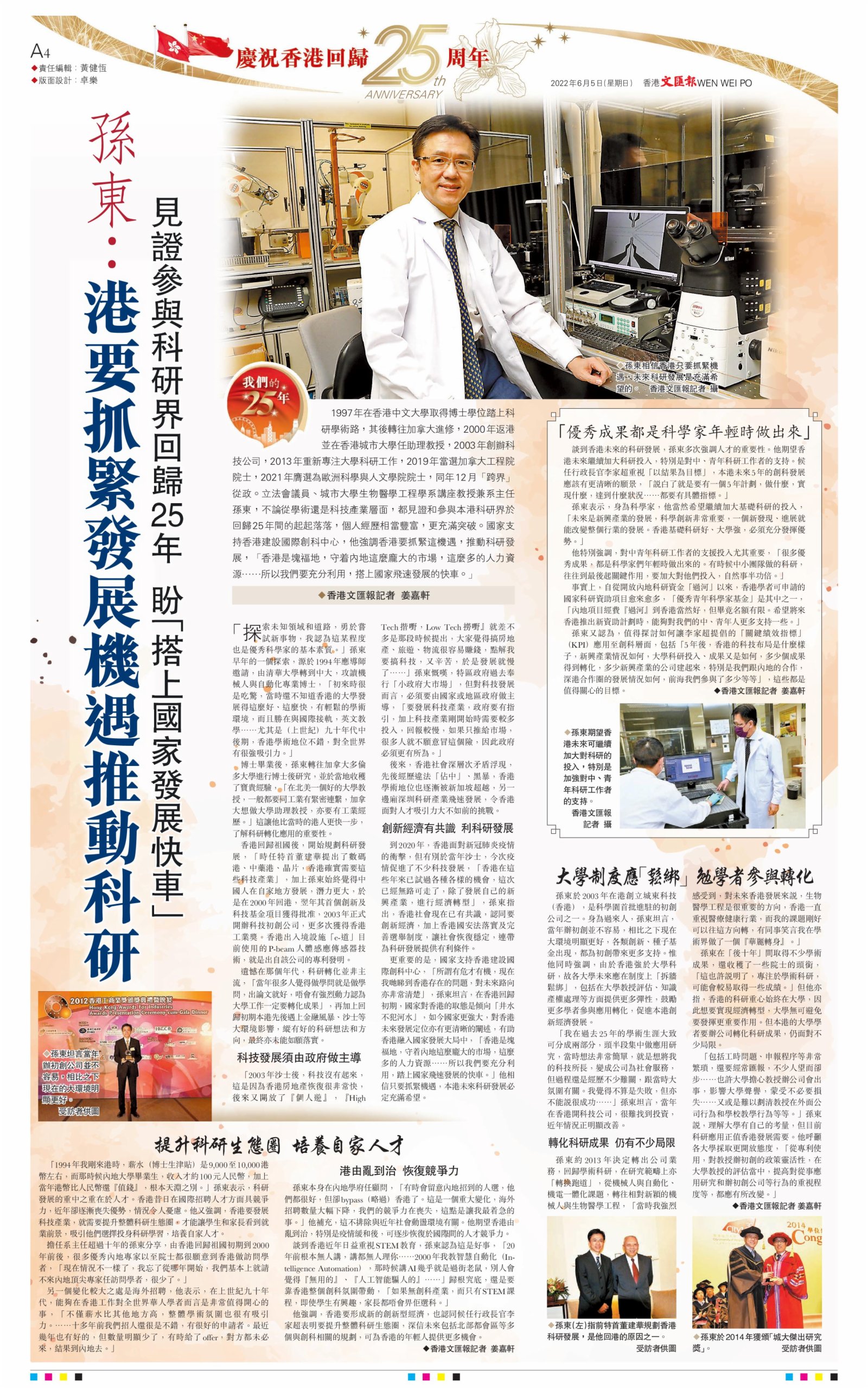 (香港文匯報記者 姜嘉軒)1997年在香港中文大學取得博士學位踏上科研學術路,其後轉往加拿大進修,2000年返港並在香港城市大學任助理教授,2003年創辦科技公司,2013年重新專注大學科研工作,2019年當選加拿大工程院院士,2021年膺選為歐洲科學與人文學院院士,同年12月「跨界」從政。立法會議員、城市大學生物醫學工程學系講座教授兼系主任孫東,不論從學術還是科技產業層面,都見證和參與本港科研界於回歸25年間的起起落落,個人經歷相當豐富,更充滿突破。國家支持香港建設國際創科中心,他強調香港要抓緊這機遇,推動科研發展,「香港是塊福地,守着內地這麼龐大的市場,這麼多的人力資源……所以我們要充分利用,搭上國家飛速發展的快車。」