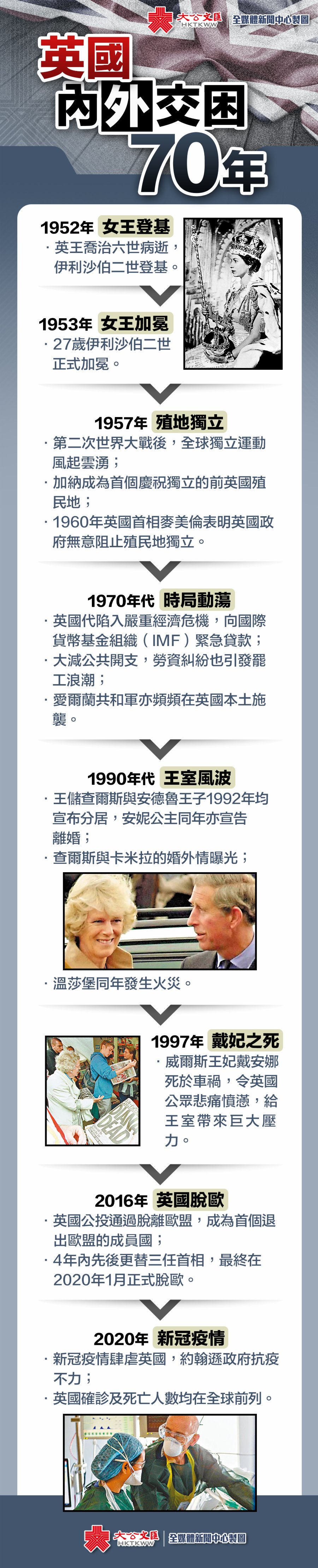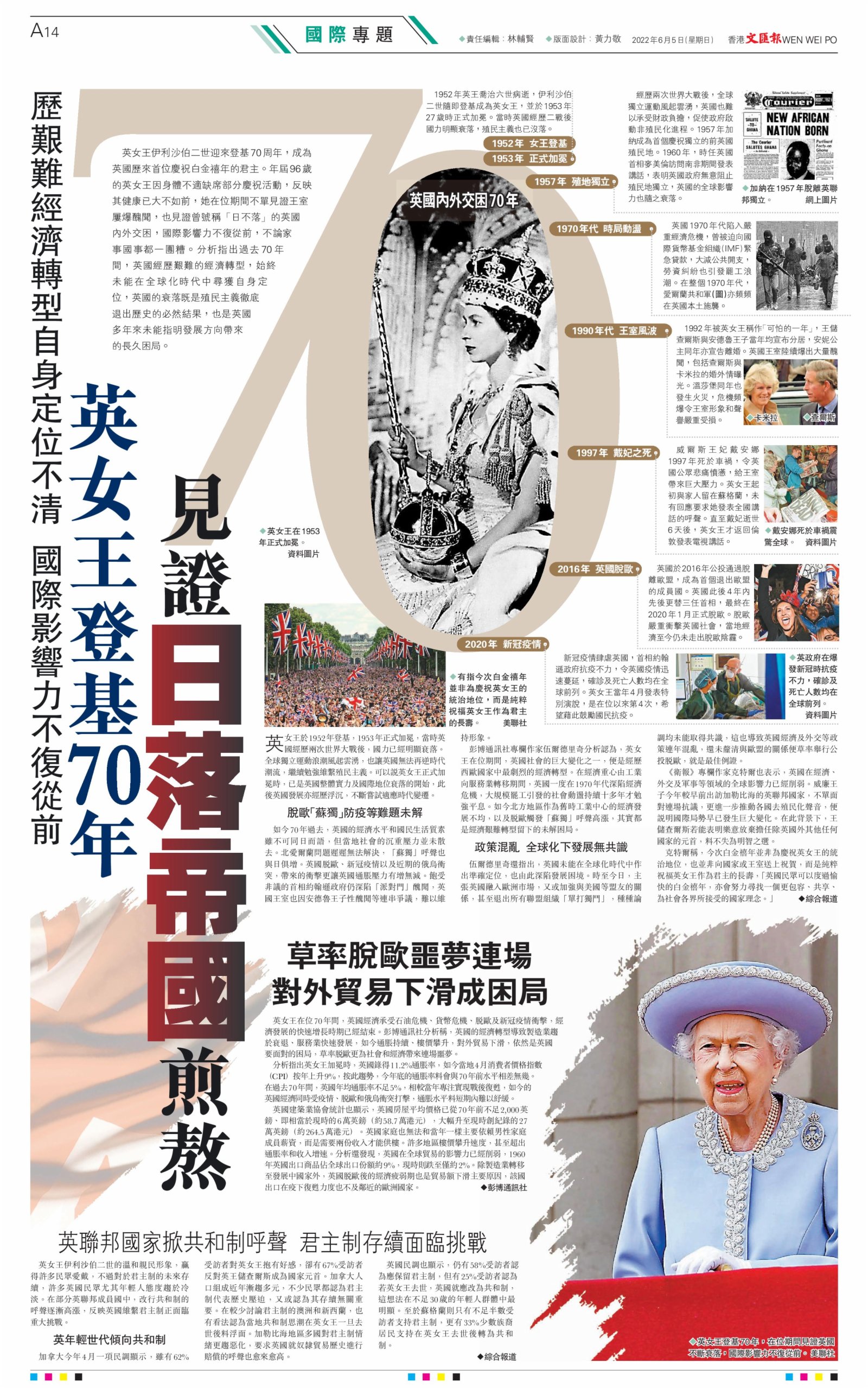 香港文匯報綜合報道:英女王伊利沙伯二世迎來登基70周年,成為英國歷來首位慶祝白金禧年的君主。年屆96歲的英女王因身體不適缺席部分慶祝活動,反映其健康已大不如前,她在位期間不單見證王室屢爆醜聞,也見證曾號稱「日不落」的英國內外交困,國際影響力不復從前,不論家事國事都一團糟。分析指出過去70年間,英國經歷艱難的經濟轉型,始終未能在全球化時代中尋獲自身定位,英國的衰落既是殖民主義徹底退出歷史的必然結果,也是英國多年來未能指明發展方向帶來的長久困局。
