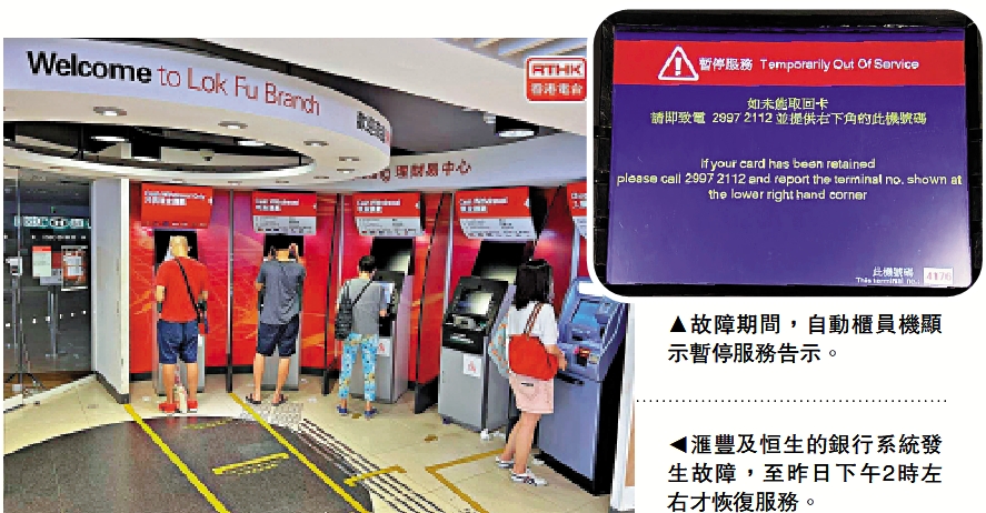 滙豐及恒生的銀行系統大約於昨日上午11時30分至下午2時故障,導致大部分自助銀行服務呈「死機」狀態。以市民最常用的手機銀行和網上銀行為例,部分市民在嘗試登入系統時,熒幕上只顯示「交易指示已被中斷,現正進行系統維修」字句,卻無法登入系統。