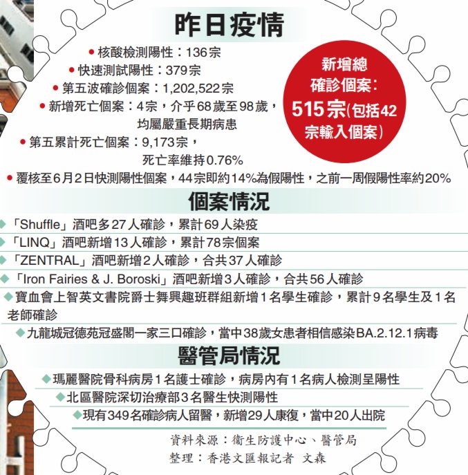 (香港文匯報 記者 文森)香港昨日新增515宗新冠肺炎確診個案,是自本月1日反彈至突破500宗後持續橫向徘徊。衞生防護中心正追蹤調查的4個酒吧群組共新增45宗個案,而九龍城再有一家三口感染Omicron BA.2.12.1新型變種病毒,顯示新變種病毒隱形傳播鏈已由太古城、灣仔延伸至九龍城一帶。衞生防護中心指本港目前即時病毒繁殖率增至1.353,即每名患者可感染超過1人,顯示疫情有上升趨勢,相信是社交距離放寬後,部分之前沒被感染的市民陸續染疫,故再次呼籲未打齊針的市民盡快接種疫苗,以及時刻保持嚴謹防疫措施。
