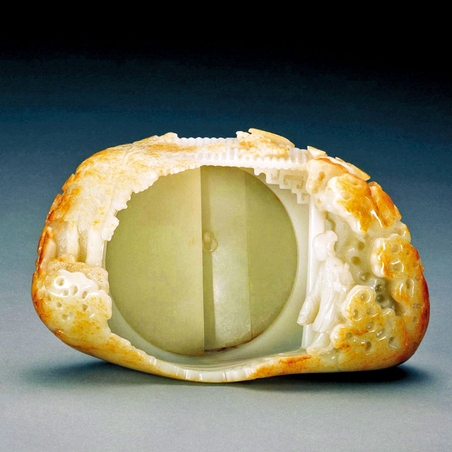 3.簡介:山子為文房常見的陳設品。此山子底部鐫有乾隆的款識及題詩各一,可知原玉本為和闐所貢,中間的部分被挖出以製碗。但經過一位佚名的蘇州玉工把本應棄置的玉材重新設計,如將挖去的圓洞化為桐蔭蔽天的月門,未經打磨的玉皮點綴為梧桐、蕉葉,從而製成此巧奪天工的工藝品。