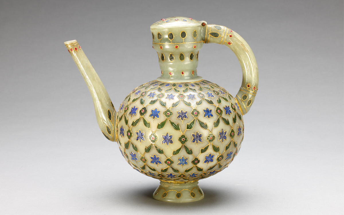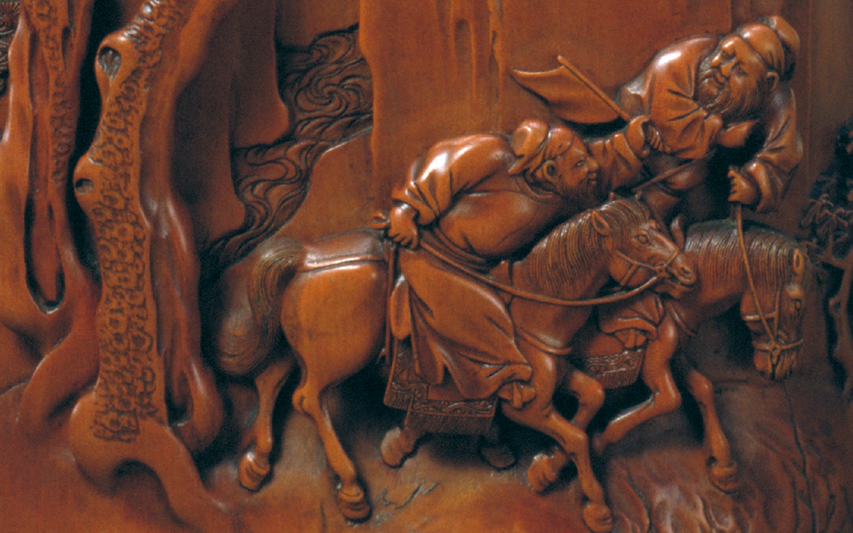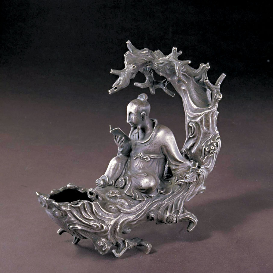 3.簡介:「槎」即木筏。據西晉張華《博物志》所記,曾有人乘槎出海,最後上達銀河,與牛郎織女相遇。以傳說中的槎為器型,製作飲具,可能為元代銀匠朱碧山首創,今日僅存4隻。此杯造型模仿盤根錯節的樹幹,中空的樹幹內可以盛酒。槎杯的主要部分由銀鑄造而成,細部用鏨刻工藝表現,人物的頭、手等部分均是獨立鑄造之後,再焊接在杯上,接焊之處混然無跡,既是實用的飲器,亦是巧奪天工的雕塑。
