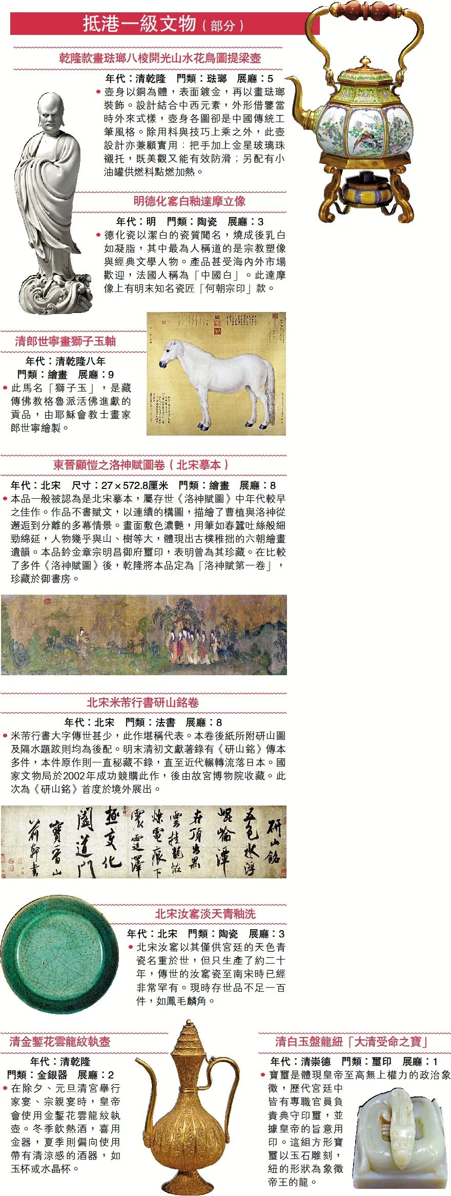 大公文匯全媒體報道,香港故宮文化博物館將於7月開幕,來自故宮博物院的914件珍貴文物,已獲中央政府批准赴港。這批珍貴文物種類豐富、名作雲集,是故宮博物院自1925年成立以來最大規模的藏品出境外借,其中166件屬「國寶」級別,借展藏品涵蓋繪畫、書法、青銅器、陶瓷、金銀器、琺瑯、玉器、漆器、玻璃、璽印、織繡、首飾、雞塑、圖書典籍、古代建築等,絕大部分文物是首次在香港公開亮相。