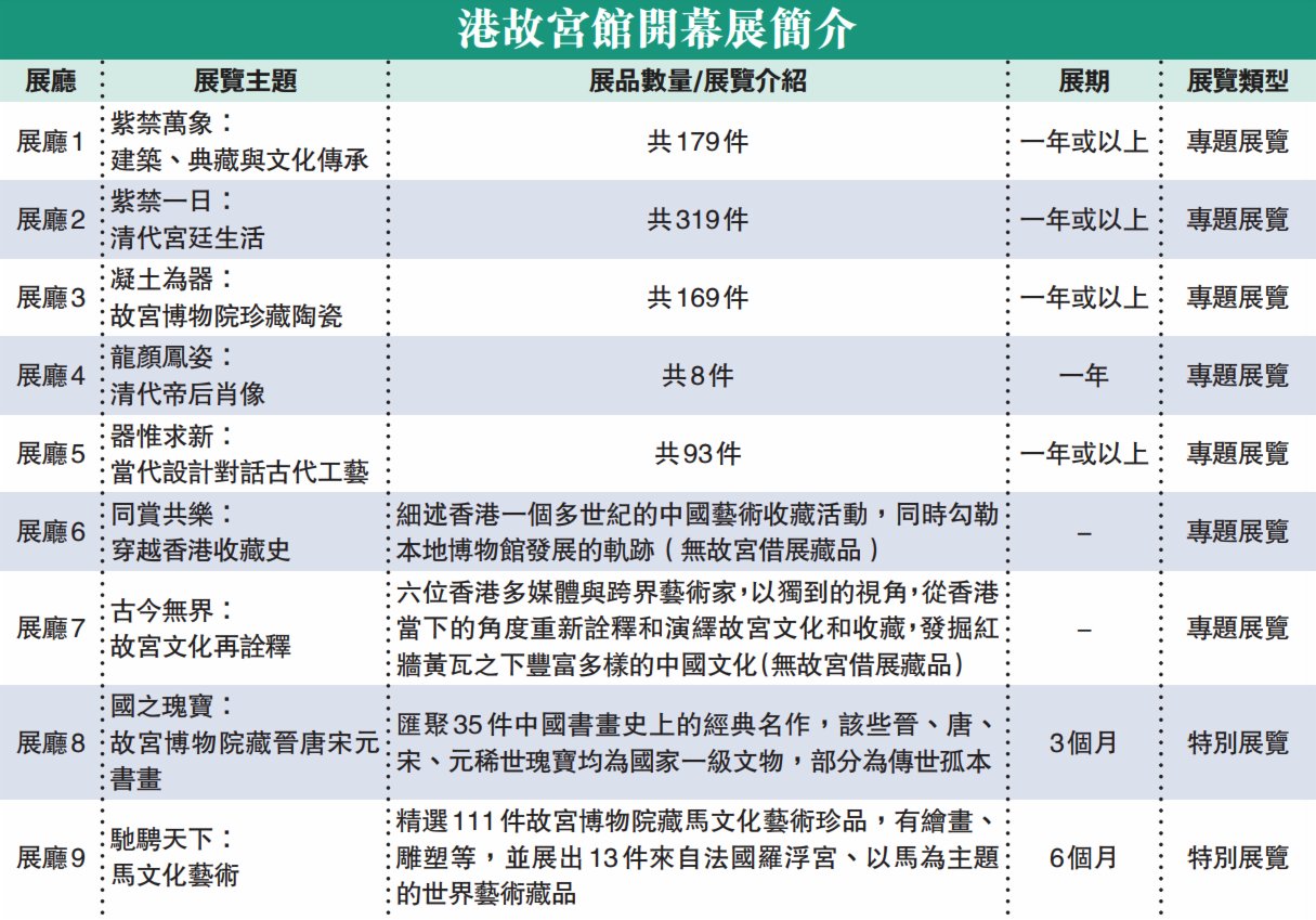 開幕展共有9個展廳展出故宮借展藏品。其中,特別展覽「國之瑰寶:故宮博物院藏晉唐宋元書畫」匯聚35件經典名作,這些晉、唐、宋、元稀世瑰寶均為國家一級文物,部分為傳世孤本,是近15年來故宮所藏古代書畫瑰寶最大規模的一次出境展覽,將在展廳8展出,展期為3個月,有意觀賞的市民須把握時間。其他展廳則分別以「清代宮廷生活」、「清代帝后肖像」等為主題,將透過文物背後的故事,帶領觀眾走入紫禁城,講述紫禁城由皇宮到博物館的轉變歷程。