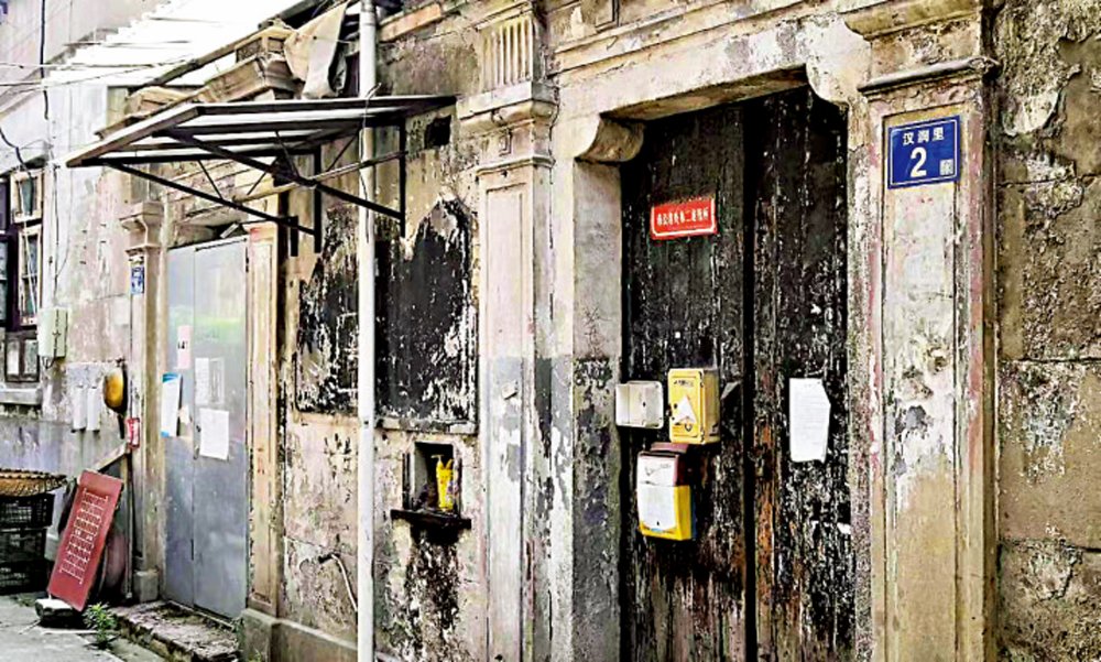 記者循着門牌號進入漢潤里右側第二條里弄,弄堂最裏面左邊第一間便是漢潤里2號,已經無人居住。記者上前仔細查看,漢潤里2號為兩層建築,木質大門緊閉,用鐵鏈緊鎖,門扇左側有市公房處第二房管所」的紅色標牌。門上油漆脫落、門板裂縫、牆面斑駁,但石庫門結構依舊完整,盡顯歷史滄桑。