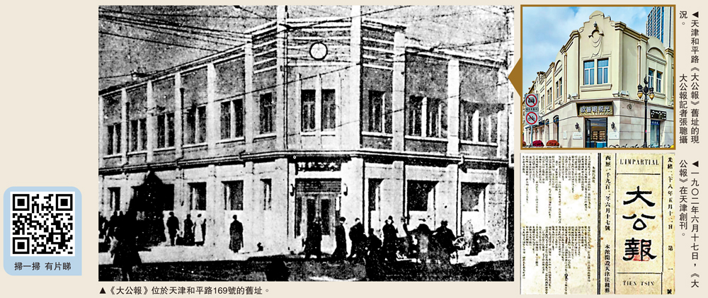 大公報記者日前走訪了位於天津和平路169號的大公報舊址,這是一幢二層磚混的日式洋樓,地上主體二層外廊式磚木結構房屋,建築平面近似呈「ㄈ」字形,造型獨特。二層屋蓋採用硬山架檁、三角形木屋架、木檁條、木望板結構,屋面為卷材防水雙坡不上人屋面。外簷牆水泥飾面,上簷精美雕飾,下配多個白色矩形窗,首層入口為券形洞門。現為一家眼鏡店,門口顯著位置懸掛着天津市文物保護單位和《大公報》舊址簡介兩塊漢白玉牌匾。