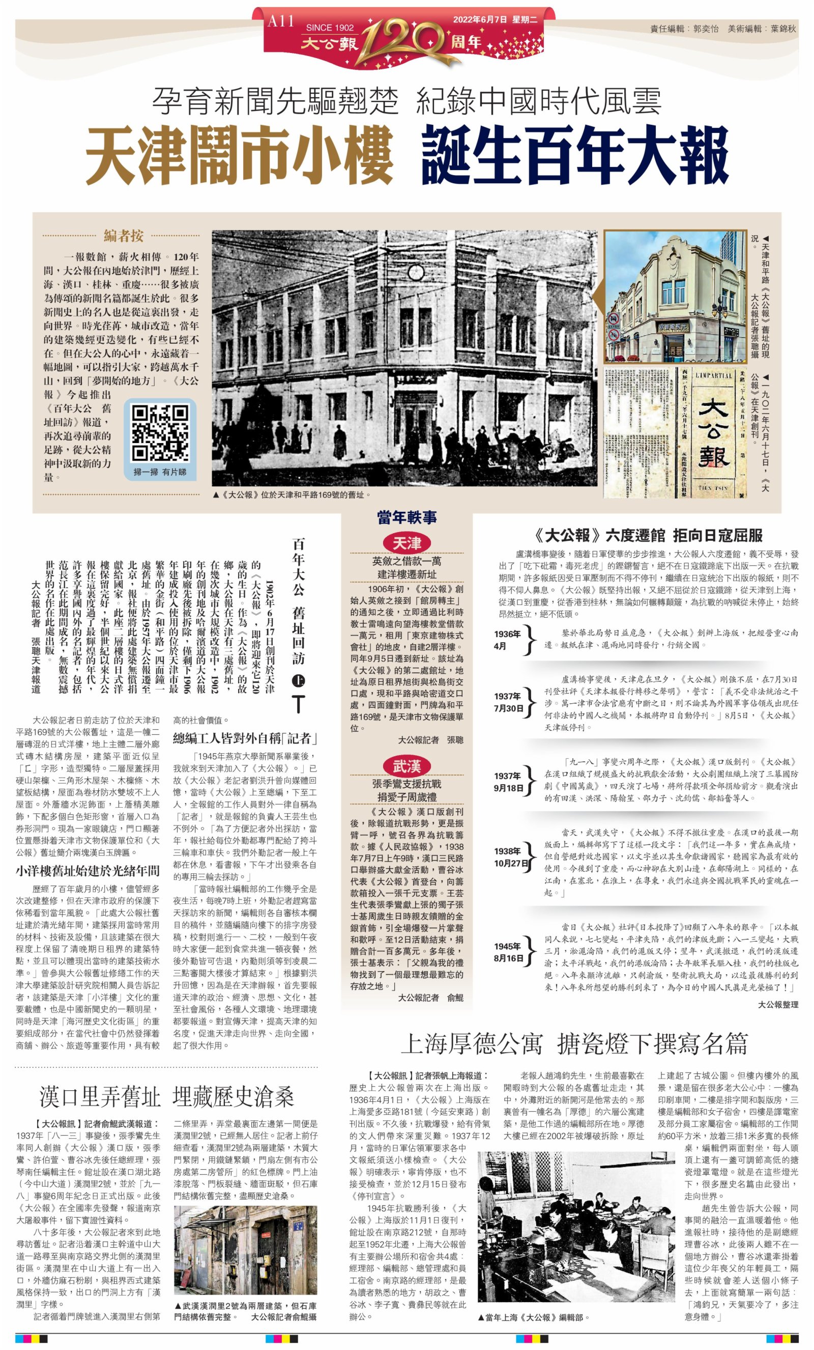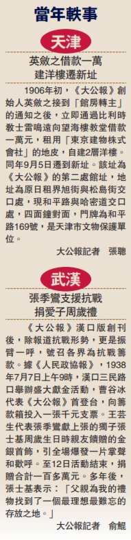 (大公報記者 俞鯤)1937年「八一三」事變後,張季鸞先生率同人創辦《大公報》漢口版,張季鸞、許伯萱、曹谷冰先後任總經理,張琴南任編輯主任。館址設在漢口湖北路(今中山大道)漢潤里2號,並於「九一八」事變6周年紀念日正式出版。此後《大公報》在全國率先發聲,報道南京大屠殺事件,留下實證性資料。