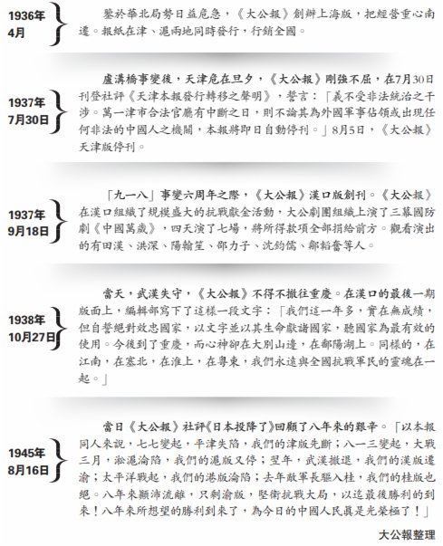 盧溝橋事變後,隨着日軍侵華的步步推進,大公報人六度遷館,義不受辱,發出了「吃下砒霜,毒死老虎」的鏗鏘誓言,絕不在日寇鐵蹄底下出版一天。在抗戰期間,許多報紙因受日軍壓制而不得不停刊,繼續在日寇統治下出版的報紙,則不得不仰人鼻息。《大公報》既堅持出報,又絕不屈從於日寇鐵蹄,從天津到上海,從漢口到重慶,從香港到桂林,無論如何輾轉顛簸,為抗戰的吶喊從未停止,始終昂然挺立,絕不低頭。