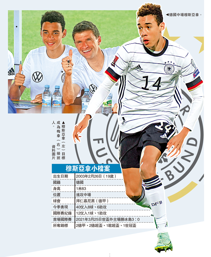 本來已被認定為英格蘭明日之星的穆斯亞拿,後來卻突然轉折選擇代表德國,可算是前主帥路維的功勞,有賴後者極力游說,兼保證其去年歐洲國家盃獲一席位,最終穆斯亞拿在去年2月宣布「棄英投德」。其實他這個決定也是極不容易,皆因英格蘭於2018年世界盃晉身4強,反觀德國在當屆及之後的歐洲國家聯賽均遭逢恥辱性成績,穆斯亞拿在德國的危難時刻「加盟」,也實在需要很大勇氣。