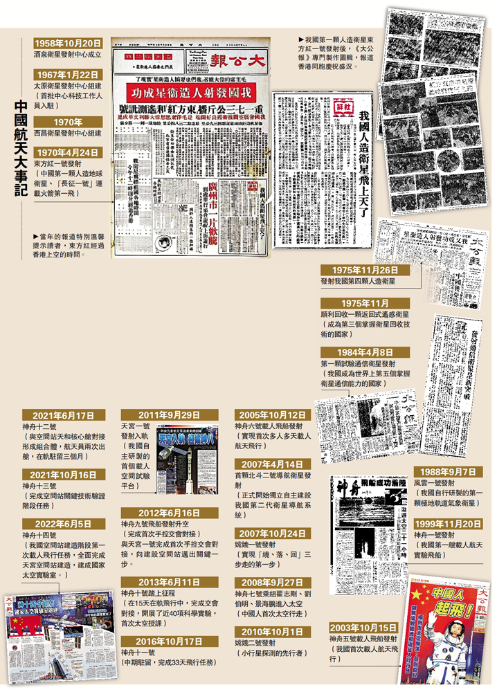 中國人探索太空的每一步都響徹星空。從無人到載人,從一人到多人,從太空行走到「嫦娥奔月」,神舟十四號徵空還開啟了中國空間站時代……一步一步走來,《大公報》一直緊貼報道國家航天科技成就,讓香港市民了解國家發展。