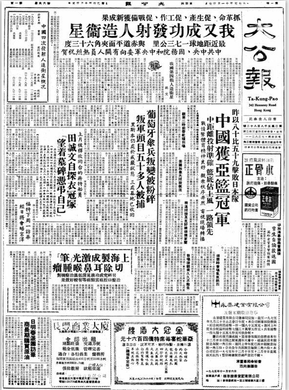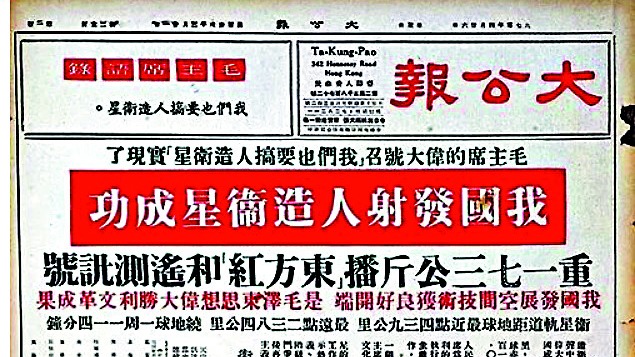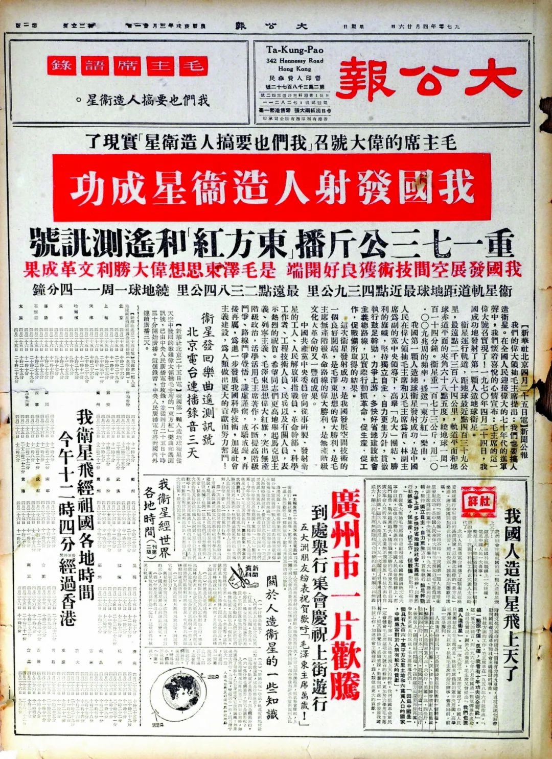 1970年4月24日,我國發射第一顆人造衛星東方紅一號。當年香港《大公報》以頭版專題報道東方紅的「威水史」,並以《我國人造衛星上天了》為題發表了社評。