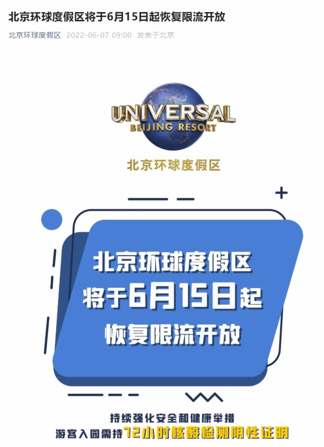 北京環球度假村公眾號6月7日消息,北京環球度假區計劃於6月15日起恢復開放。其中,環球影城大酒店、諾金度假酒店計劃在6月14日向入住客人開放,北京環球城市大道將在同日開啟營業,北京環球影城主題公園於6月15日正式開放。