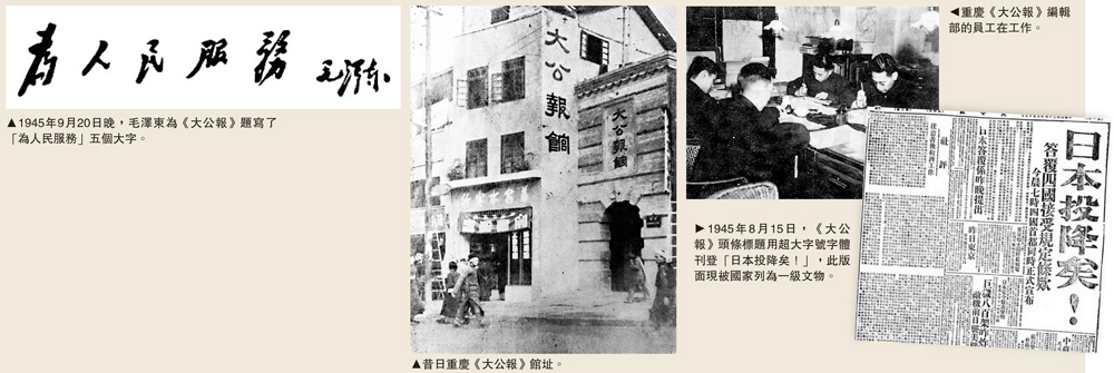 1945年8月28日,毛澤東飛抵重慶,與國民黨舉行國共和談。毛澤東在渝會見了很多民主人士,重慶《大公報》編發了消息和特寫,連夜趕寫了題為《毛澤東先生來了!》的社評。9月20日晚,《大公報》作為東道主,在李子壩報館內的「季鸞堂」設宴招待毛澤東、周恩來、董必武、王若飛等中共代表團成員。晚宴上,毛澤東說,希望《大公報》能夠成為為人民大眾說話的報紙,並為大公報全體員工題寫了「為人民服務」五個大字。這是他對這份報紙的期望,也是對國家未來的期望。