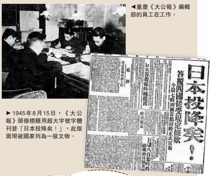 《大公報》為抗戰的呼籲和吶喊從未停止過,亦是重慶抗戰歷史的重要載體。已故百歲老人張炳富在《大公報》任職期間逢日軍對重慶大轟炸,是大轟炸的倖存者和見證人。「轟炸嚴重時期,編輯部與印刷廠都搬到防空洞繼續作業,大家在對開平板印刷機的轟鳴聲中寫稿、編輯、校對、印刷。在日軍對重慶長達五年半的轟炸中,從未停止出報。」10年前老人接受大公報記者採訪時回憶道。