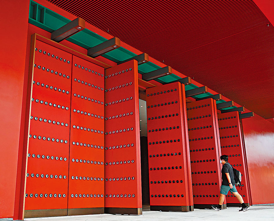 昨日記者會後,傳媒代表可參觀香港故宮館正門入口及平台廣場。香港故宮館建築仿古氣息濃郁,大門仿造宮門,使用正紅色並配門釘,上層建築以金色為主,類同北京故宮金碧輝煌的瓦頂,整個建築呈倒梯形,造型威嚴莊重。廣場設計空曠,鋪灰白兩色地磚,場地邊緣處有仿效皇家庭園的「流觴曲水」,遠眺可觀賞維港兩岸,古色古香的故宮館與現代化的摩天大樓交相輝映。