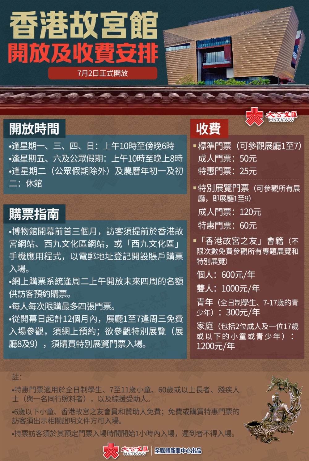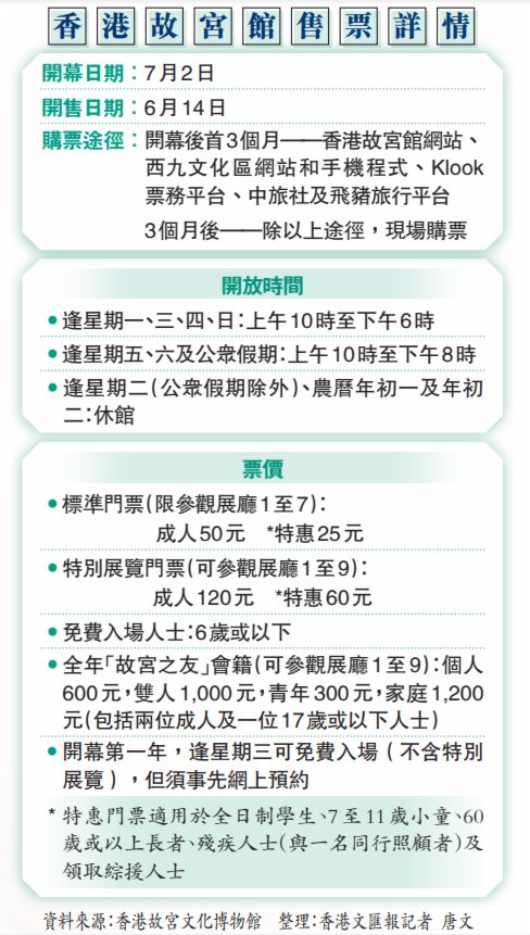 (香港文匯報 記者 唐文、江鑫嫻)香港故宮文化博物館昨日宣布,下月2日起正式向公眾開放,成人門票分為兩類,分別是50元可參觀7個常設展覽,以及120元可額外觀看餘下兩個特別展覽的門票,本月14日(下周二)起接受網上訂票。常設展覽展期為一至兩年,開放首年逢星期三免費開放。開幕展萬勿錯過,因為當中35件中國書畫史上經典名作屬於國家一級文物甚至是傳世孤本,為免光照及濕度造成損壞,部分展品僅展示1至3個月後便會被運返北京故宮,然後或要「休眠」數年才有機會再度「出宮」。香港故宮館呼籲市民把握是次良機,一窺國寶真容。